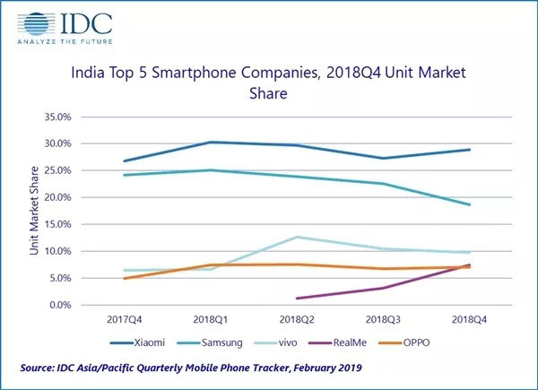 Counterpoint 的数据显示,Realme推出不久就迅速蚕食了印度智能手机市场 1% 的份额。在2018年第4季度,Realme一举成为印度手机市场第四大品牌。