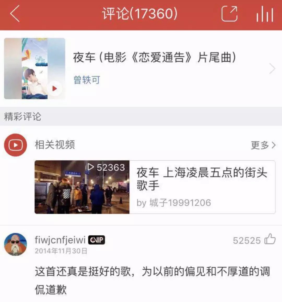 在网易云音乐《夜车》的评论里,有一句留言被赞了5万多次,“这首还真是挺好听的歌,为以前的偏见和不厚道的调侃道歉。”