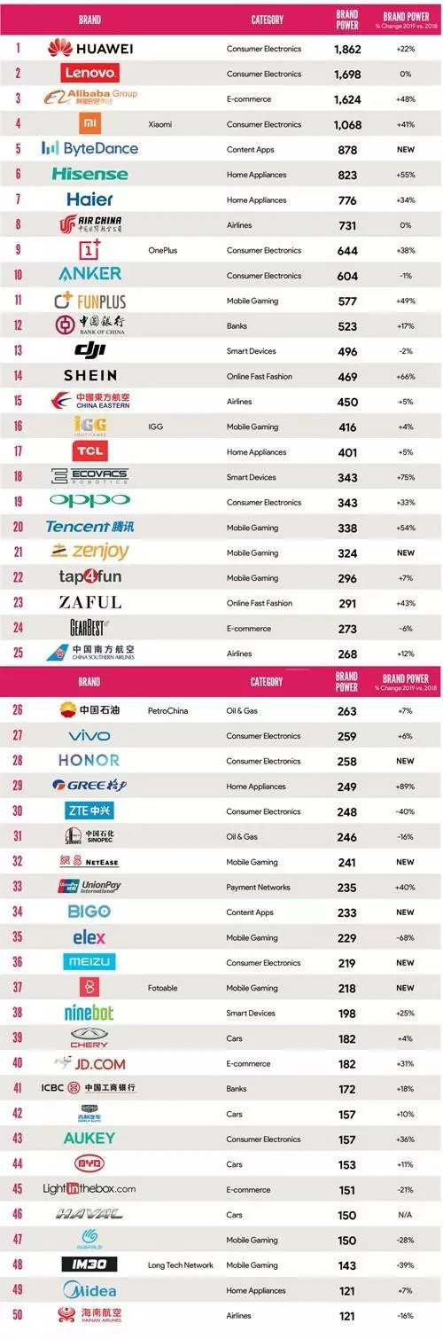 3月29日消息,广告传播集团WPP和凯度(Kantar)联合发布了《2019年BrandZ中国出海品牌50强》排行榜,在今年的榜单中,华为跃居榜首,而去年的冠军联想退居次席,阿里巴巴和小米分列第三和第四位。除了华为、联想、阿里巴巴和小米,第五至第十位还包括海信、海尔、中国国航、一加等。