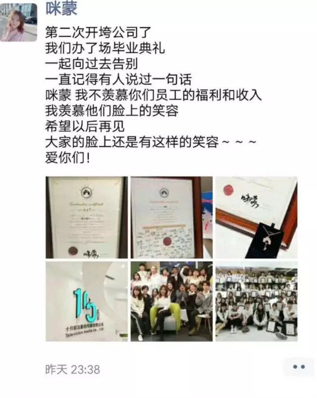 随后,咪蒙发布朋友圈调侃“第二次开垮公司”,“我们办了场毕业典礼,一起向过去告别。一直记得有人说过一句话:咪蒙,我不羡慕你们员工的福利和收入,我羡慕他们脸上的笑容。希望以后再见,大家的脸上还是有这样的笑容。爱你们”。