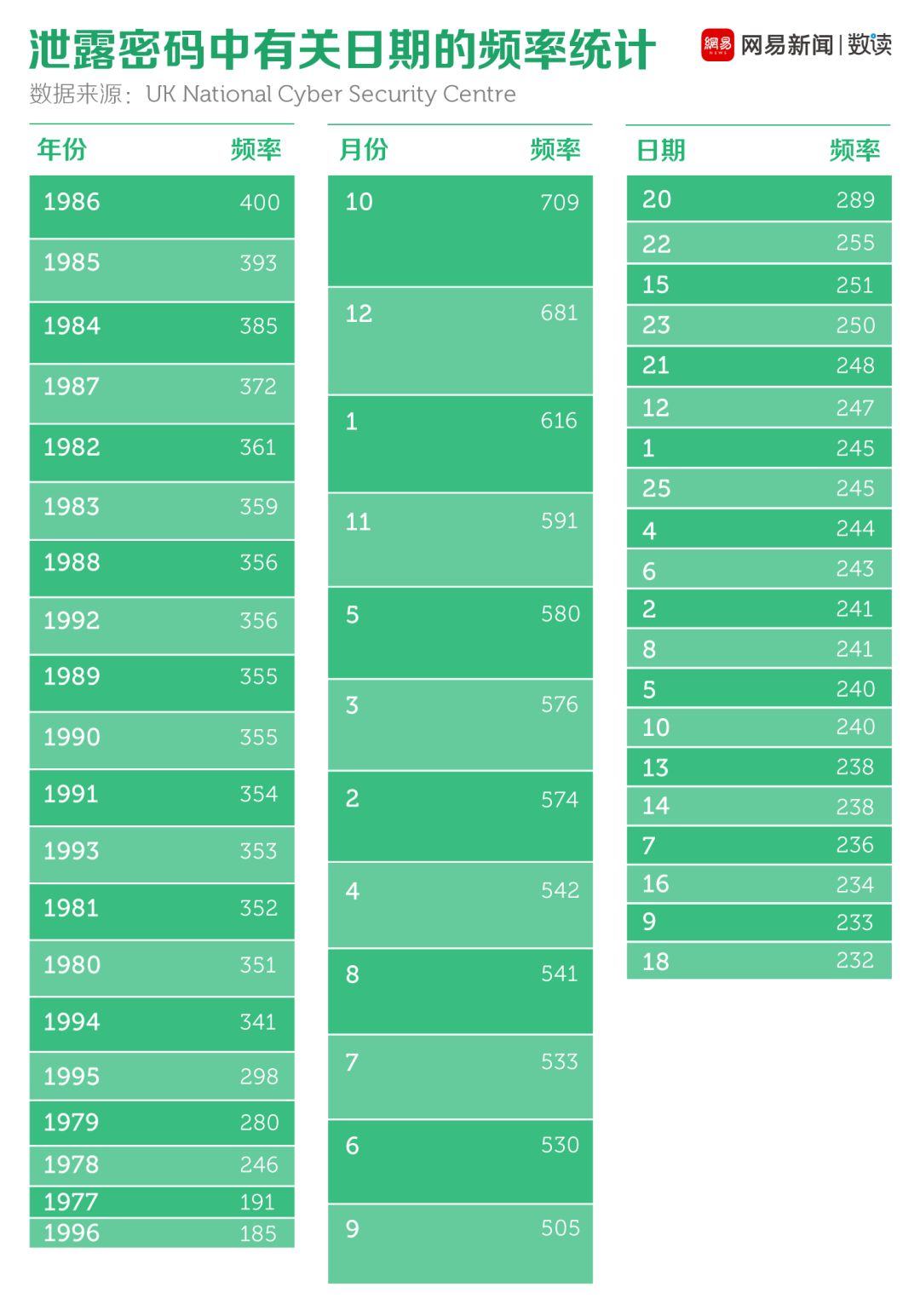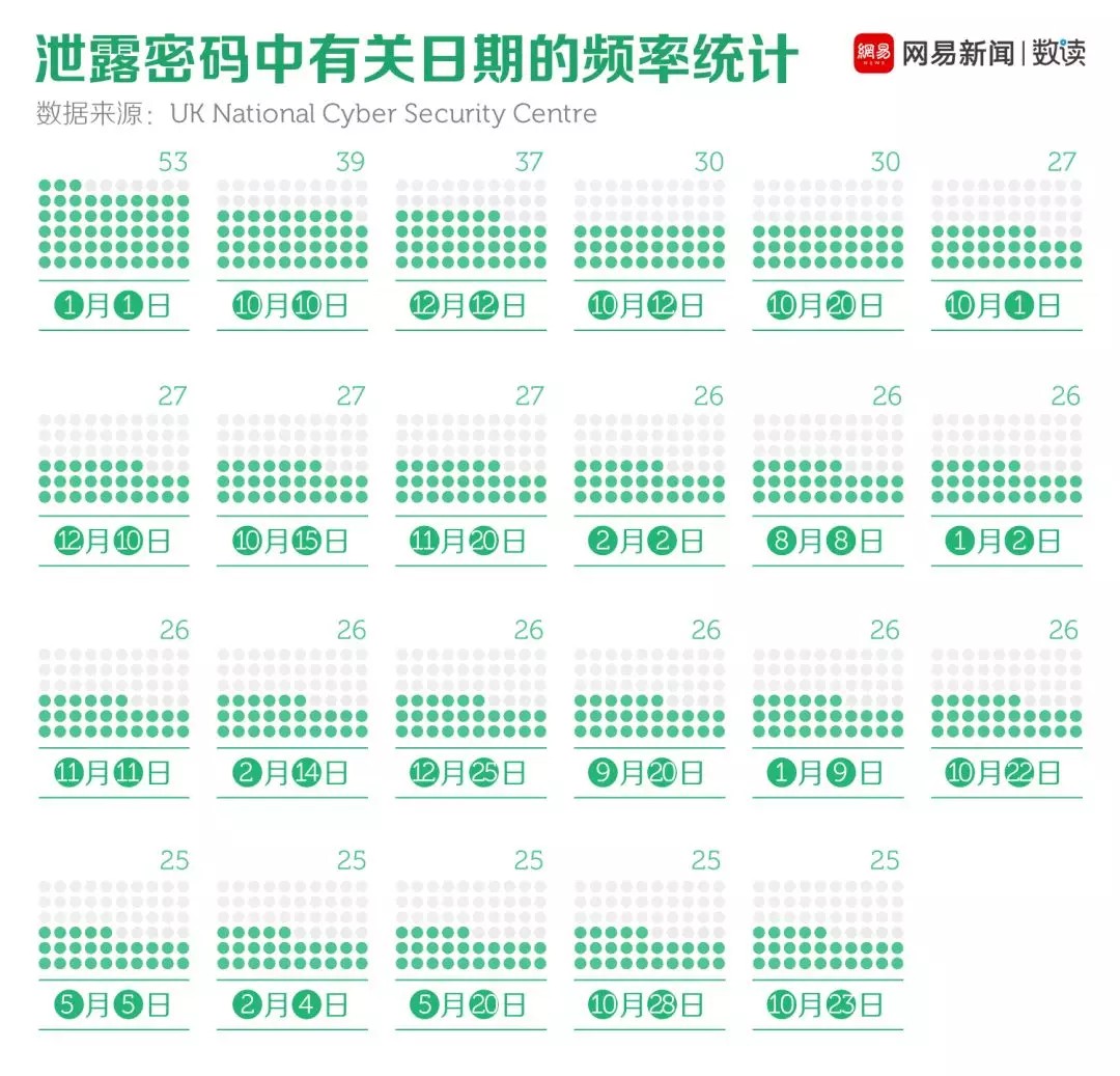 如果综合考虑月份和日期的话,大家对一年的第一天情有独钟,在10万条最常用泄露密码中出现了53次,10月10日和12月12日紧随其后。