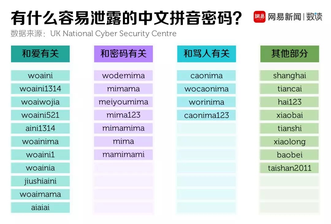 中国人也爱用“爱”作为自己的密码,比如“woaini”、“woaini521”、“aini1314”之类的海誓山盟。