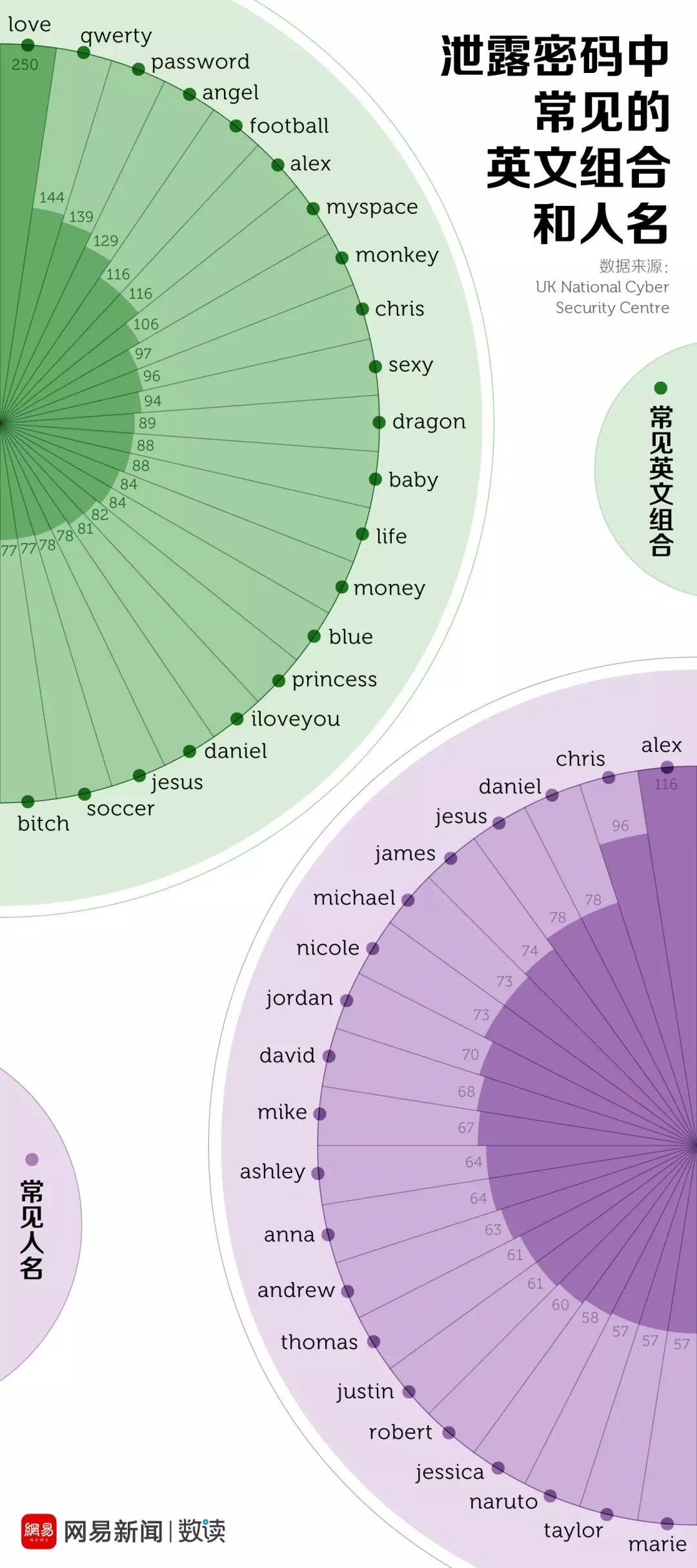 在密码中最常出现的英文名是是“alex”,出现了一共116次。而日式英文名“naruto”在英文名字中显得格外瞩目,作为鸣人的英译名,可以看出这部漫画在世界范围内的影响力。