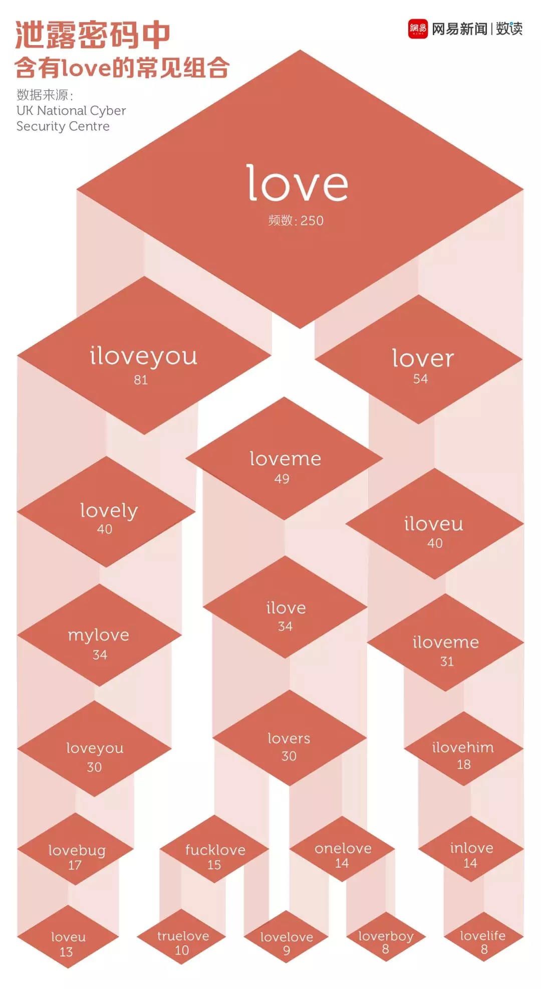 最常见的英文单词是“love”,将近是第二名“qwerty”的两倍。同时,带有love单词的长字段组合也有较高频次,比如“iloveyou”和变体“iloveu”分别出现81次和40次。看来能够击败人类选取密码时惰性的可能只有对某人私密的爱吧。