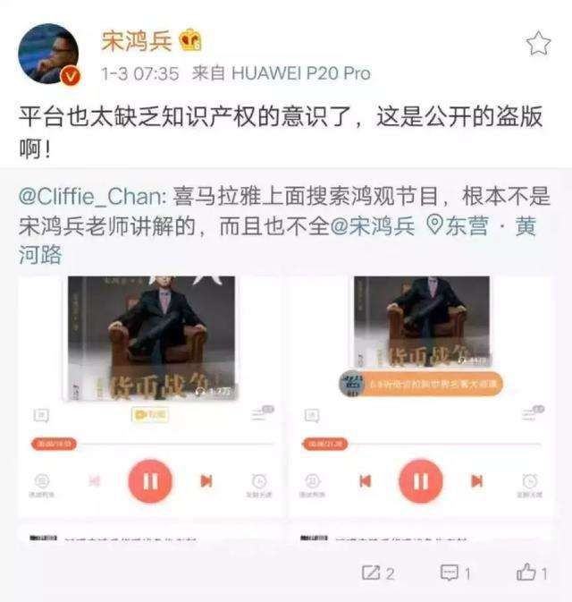 在这里,我们举两个例子,首先是“真假宋鸿兵”事件。平台上搜索宋鸿兵的节目《鸿观》,结果并不是由宋鸿兵讲解的,而是一个“李鬼”在给大家讲解。该账号运营了有大半年的时间,播放量7.3万,有两千多人订阅。结果,宋鸿兵本人转发了这条微博,称“平台也太缺乏知识产权的意识了,这是公开的盗版啊!”