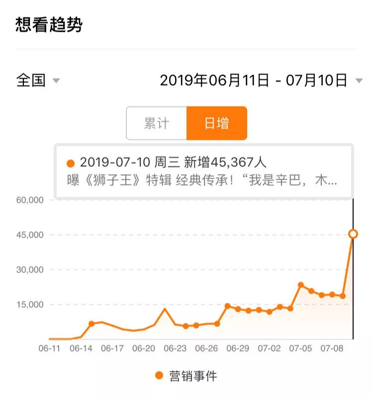 灯塔专业版数据显示,《狮子王》的想看人数,也在7月9日到7月10日之间经历了大幅度增长。