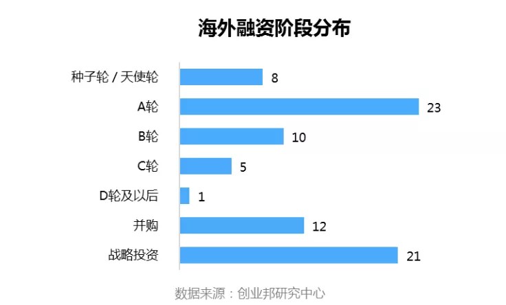 本周国外融资事件的融资轮次主要集中在A轮、并购、战略投资,其中A轮事件最多,23起;战略投资次之,21起;并购事件第三,12起。