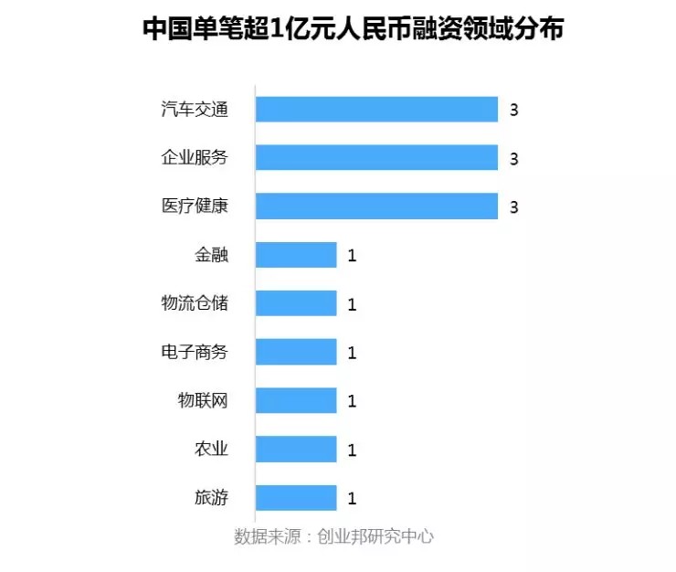 单笔融资额过亿的融资案例主要集中在汽车交通、企业服务、医疗健康领域。
