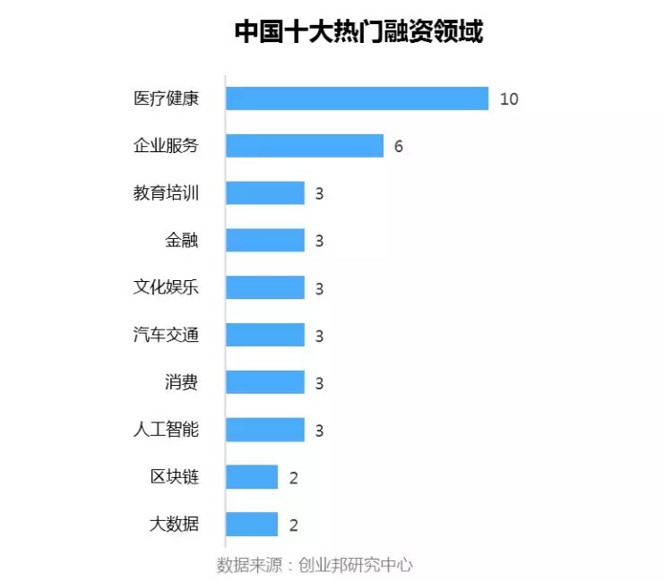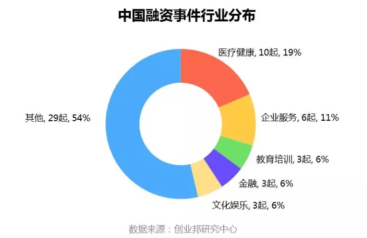 本周披露融资事件涉及21个行业领域,其中融资案例数最多的五大行业分别是:医疗健康10起,企业服务6起,教育培训、金融、文化娱乐、汽车交通、消费、人工智能并列3起。