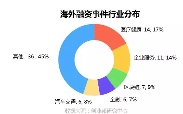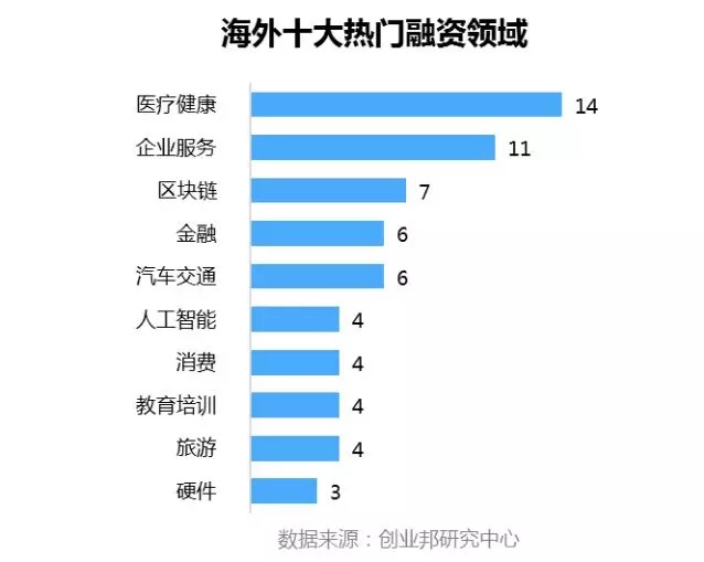 本周披露国外融资事件涉及23个行业领域,其中融资案例数最多的五大行业分别是医疗健康14起,企业服务11起,区块链7起,金融、汽车交通并列6起。