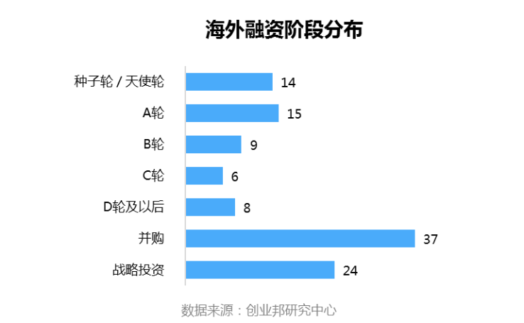 本周国外融资事件的融资轮次主要集中在并购、战略投资,其中并购事件最多,37起;战略投资次之,24起,A轮第三,15起。