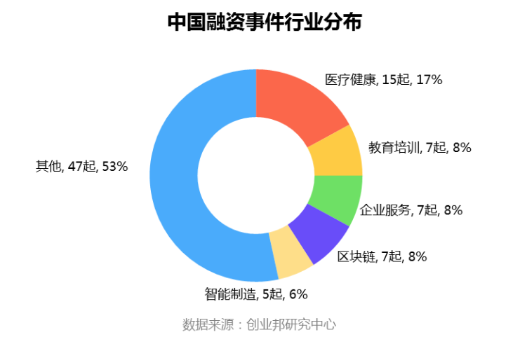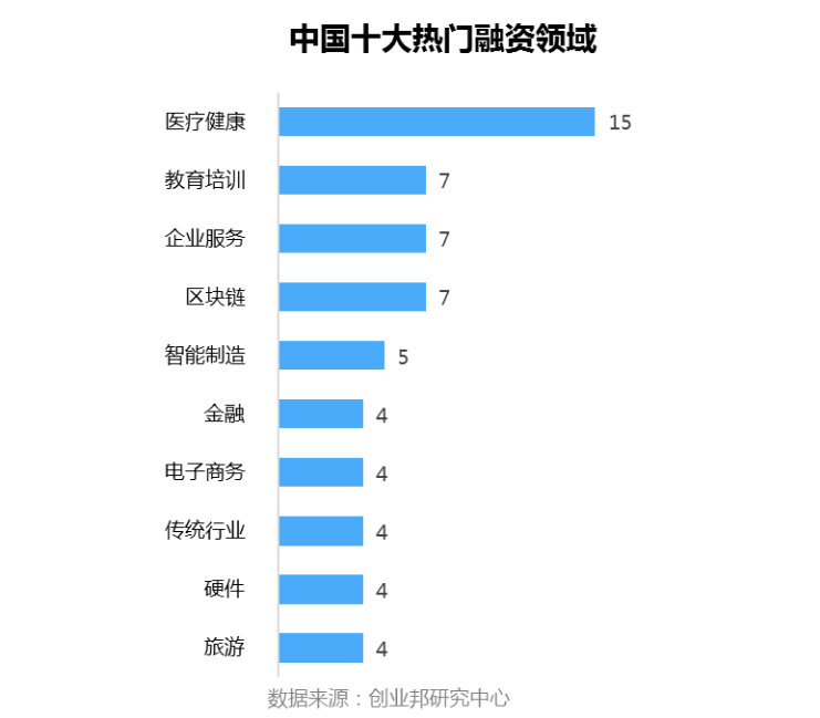 本周披露融资事件涉及27个行业领域,其中融资案例数最多的五大行业分别是:医疗健康15起,教育培训、企业服务、区块链并列7起,智能制造5起。