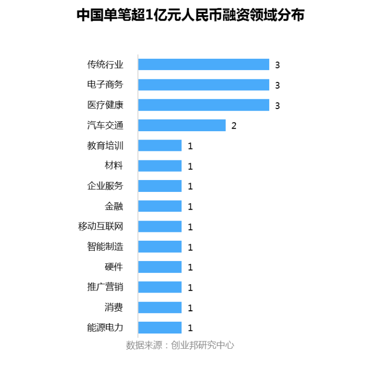 单笔融资额过亿的融资案例主要集中在传统行业、电子商务、医疗健康领域。