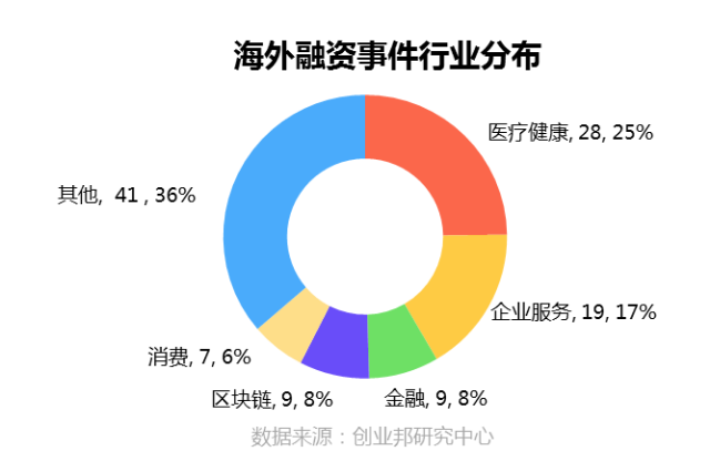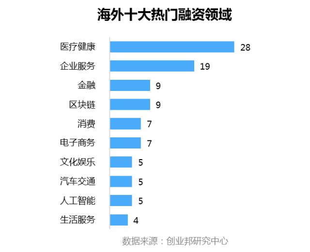 本周披露国外融资事件涉及22个行业领域,其中融资案例数最多的五大行业分别是医疗健康28起,企业服务19起,金融、区块链并列9起,消费、电子商务7起。