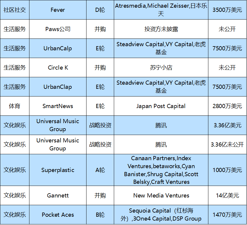 Fever获投3500万美元D轮融资,该轮融资由日本乐天Rakuten(领投)、Atresmedia、Michael Zeisser投资。Fever是一家总部位于伦敦的城市体验平台,创建于2014年,专门为用户提供娱乐活动的发现平台,欧洲知名媒体集团Atresmedia以及阿里巴巴集团美国投资部门的前主席Michael Zeisser等现有投资商参与了投资。