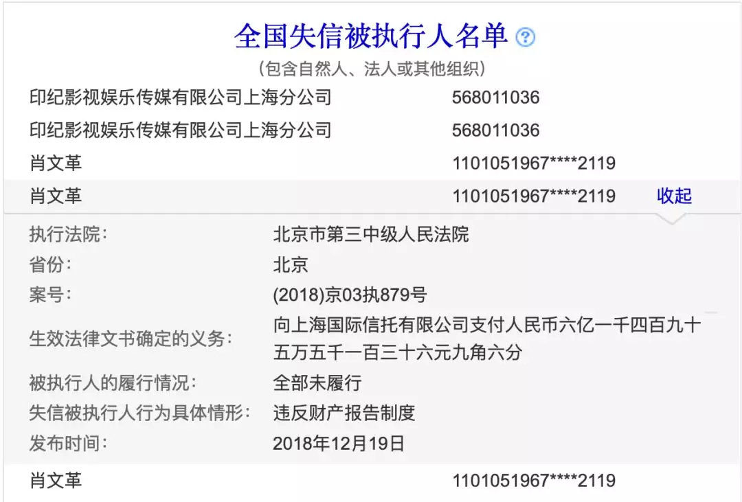 7月7日,印纪传媒宣布重组失败,2.5亿的保证金也没能收回。两天后,印纪传媒复牌,直接7个跌停。在跌破平仓线后,肖文阁持有的印纪传媒44.04%的股份也被轮候冻结,大量诉讼随之而来。年底,肖文阁因拖欠十多亿案款被法院列入失信被执行人和限制消费人员名单。