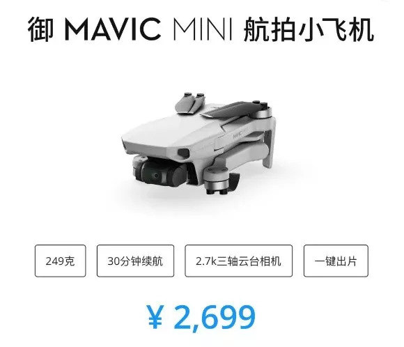 【大疆发布御Mini航拍小飞机,售价2699元】大疆30日正式发布御Mini航拍小飞机,机身可折叠,重量为249g,配备1200万像素航拍相机与三轴机械增稳云台,可拍摄2.7K视频,支持4公里图传与30分钟续航,价格为2699元,即日起开始接受预定,11月11日正式发售。