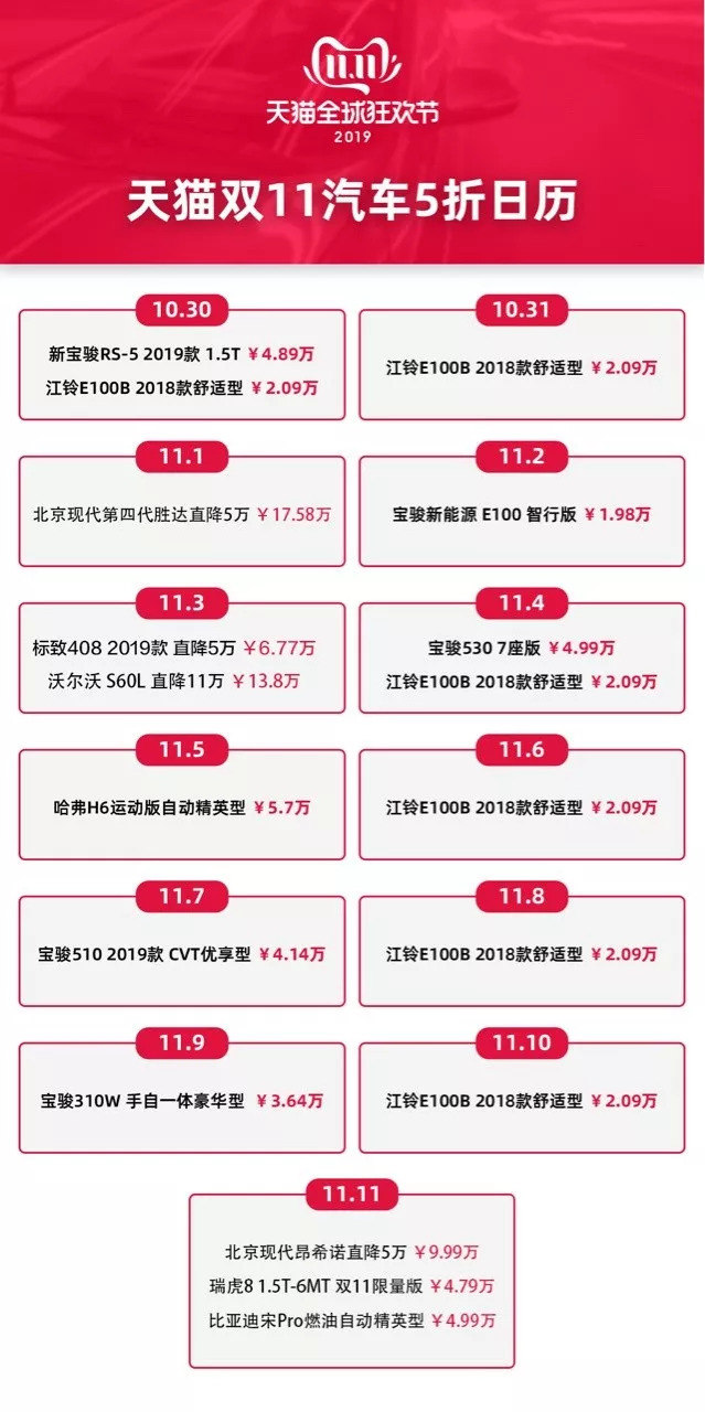 【天猫双11推出限量半价销售汽车活动】10月30日消息,今年天猫双11推出半价买车活动,10月30日至11月11日,沃尔沃、北京现代、哈弗、比亚迪、宝骏、江铃等十余品牌,每天在天猫限量半价销售汽车。此外,今年天猫双11还推出汽车24期分期免息,实现低首付、低日供购车。
