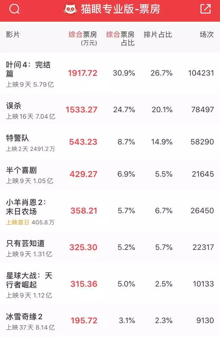 一方面是国内电影市场增幅放缓。数据显示,截止今天,12月累计票房达到31.7亿,较去年同期后退1.6亿。国产《解放·终局营救》《特警队》等新片上映两天,但市场依旧由《叶问4》《误杀》领跑。虽然此后还有《宠爱》《亲爱的新年好》《妙先生》等电影上映,但是12月的票房增长幅度保守预期不会太大。