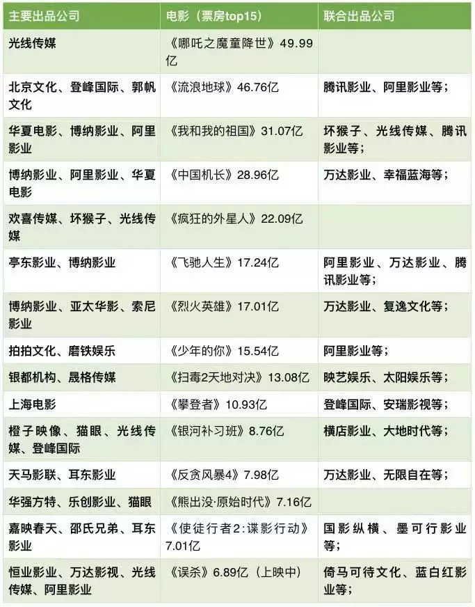 大档期孵化出现象级爆款,春节档冠军《流浪地球》票房46.76亿,暑期档爆款《哪吒之魔童降世》票房49.99亿,国庆档则孵化出献礼商业片《我和我的祖国》《中国机长》。同时传统电影公司持续产出之外,腾讯影业等互联网电影公司开始更多布局,连接产业上下游,更突出的是各类新贵公司冒出,爆款背后公司话语权在逐步迭代。