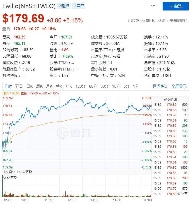 财报显示,Twilio第一季度实现营收3.65亿美元,较去年同期增长57%;第一季度运营亏损9270万美元,同比扩大。因营收表现强劲,受此影响,Twilio股价周四大涨近40%。截止文章发稿,Twilio盘后股价为179.96美元,盘后微涨0.15%,市值为251.51亿美元。