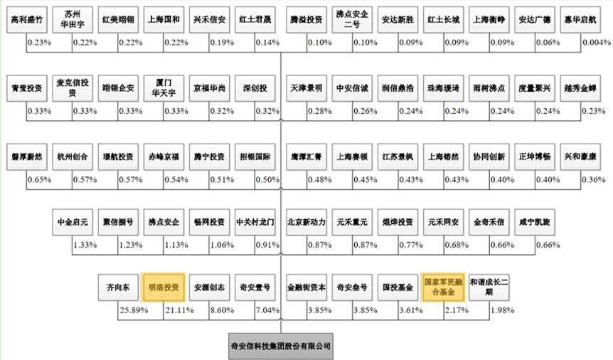 此次上市前,奇安信实际控制人齐向东合计控制公司38.34%的股份,其中直接持有公司25.89%的股份,通过其控制的安源创志、奇安叁号间接控制本公司12.45%的股份。中电金投控股有限公司旗下明洛投资为第二大股东,持股为21.11%。安源创志持股为8.60%,奇安壹号持股为7.04%,金融街资本持股为3.85%,奇安叁号持股为3.85%,国投基金持股为3.61%。另外,奇安信招股说明书中披露,深创投、中金启元、澜峰资本等机构也位列奇安信股东名单。从这一点看,奇安信的股东可谓“星光熠熠”。