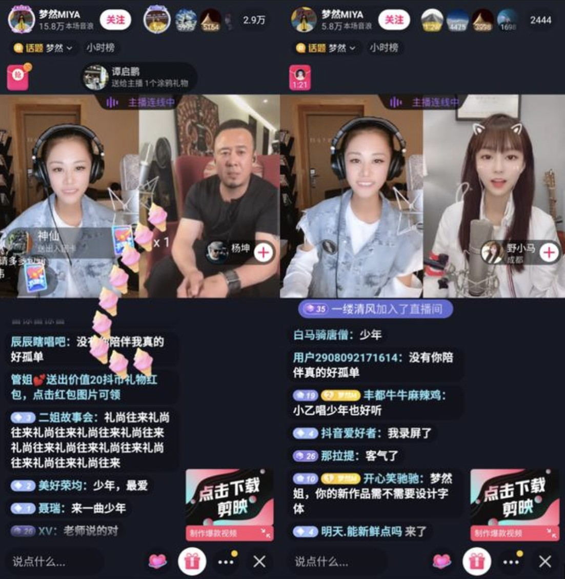 像是《少年》在抖音的走红就绝非偶然。在4月初发现这首朗朗上口的歌曲有爆发的潜质之后,抖音音乐就进行了一系列的运营动作来助推这首歌的影响力上升,比如说发起了#我还是从前那个少年 的站内活动,邀请原版演唱者梦然空降直播间,与《少年》视频模板制作者钟大胖、抖音达人野小马、主持人大兵等等连线对谈。这场直播甚至在网友的“神助攻”下,吸引来了同样在直播的音乐人杨坤,让双方进行了一次意料之外的连线,打造了一个意料之外的传播事件。
