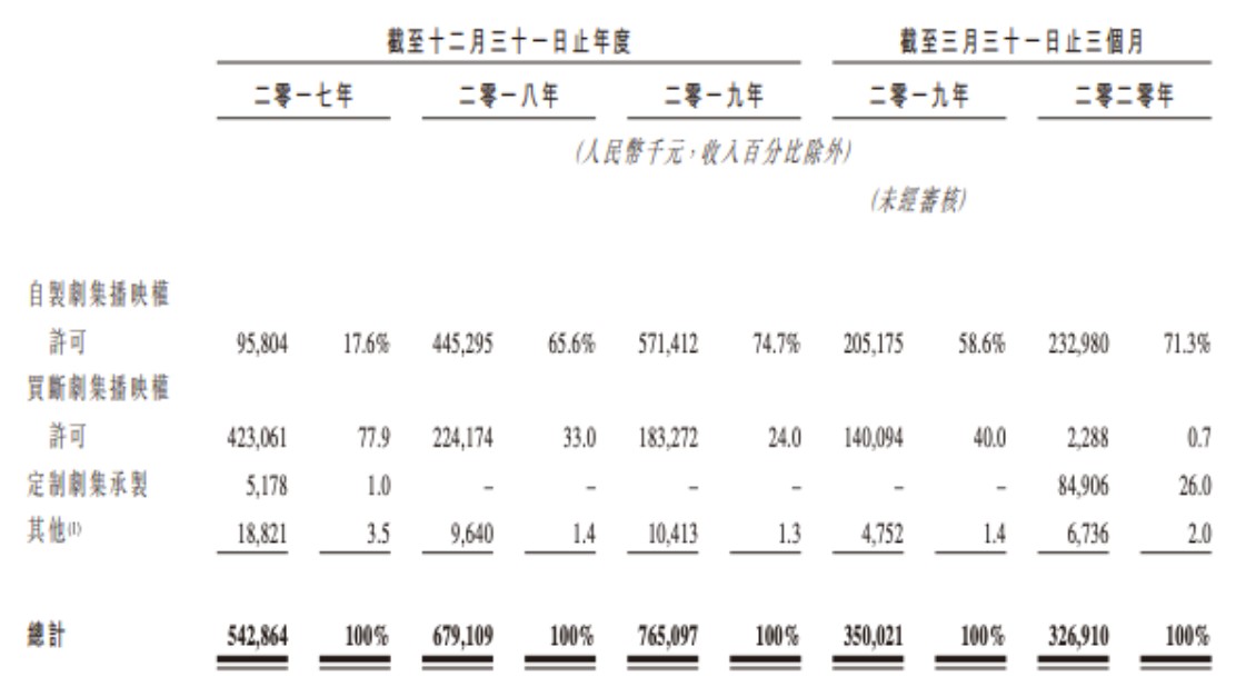 2017年至2019年,稻草熊总营收为5.43亿元、6.79亿元、7.65亿元,今年一季度总营收为3.27亿元,自制剧集播映权许可是其第一大收入来源。