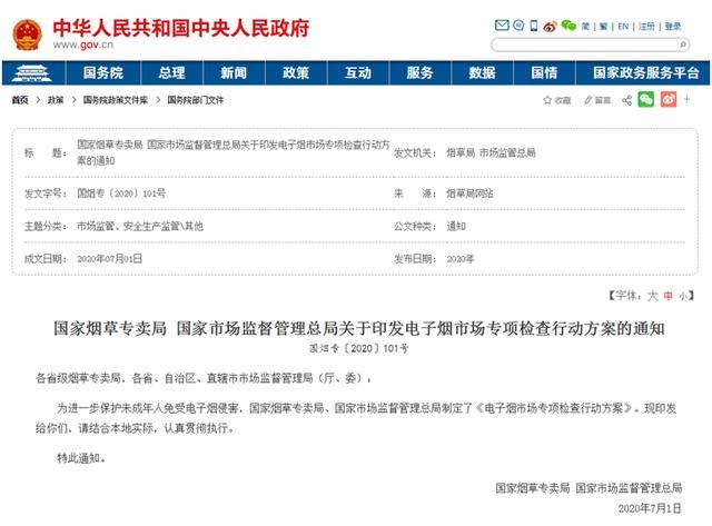7月14日,国家烟草专卖局、国家市场监督管理总局制定了《电子烟市场专项检查行动方案》,以更加严格的监管措施、更加严厉的治理手段,全面清理互联网电子烟售卖。