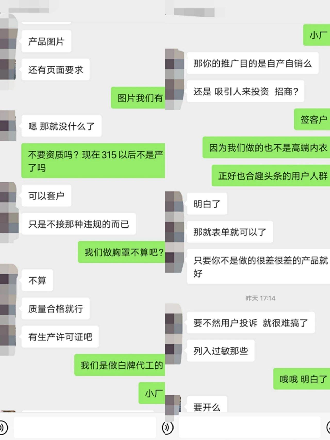 在与渠道商沟通的过程中,记者发现,趣头条的广告审核依旧处于灰色地带。记者以一家内衣代工厂的身份询问一位代理商,后者明确表示,没有资质可以“套户”(在合规商品的账户上投放)跑,甚至没有生产许可证,只要不是“很差很差的产品”,也能投放。