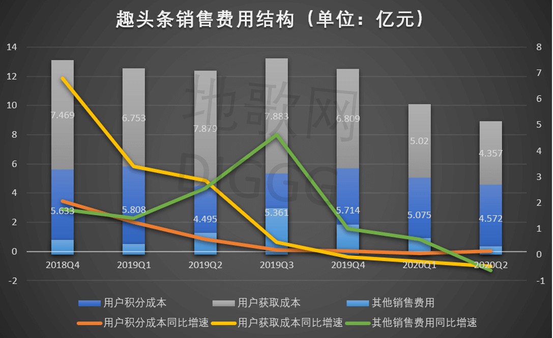 具体来看,趣头条本季度的用户积分成本达4.572亿元,同比小幅增长1.7%,环比收窄约10%;用户获取成本达4.357亿元,同比收窄44.7%;其他销售费用为3250万元,同比收窄61.5%。
