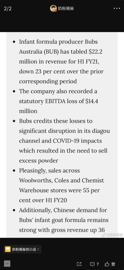 2月26日,知名博主@奶粉揭秘表示,澳大利亚婴儿配方羊奶粉生产商Bubs近期公布了2021财年第一季度财报,数据显示营收为2220万澳元,比上一财年同期下降23%,亏损1440万澳元,而亏损的缘由居然是因为疫情导致代购销售渠道中断引起的。