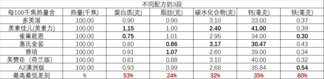这也就让国内外品牌的奶粉,在1、2段时核心的要素含量相差不大,可到了3、4段奶粉,国内外品牌之间的差距非常大。某国产奶粉研究所检测后发现,各家的3段奶粉,类似蛋白质等核心指标的差别能超过50%。