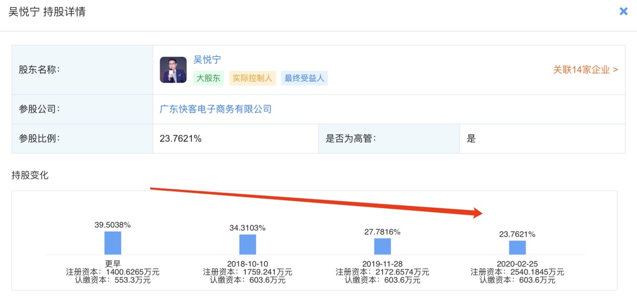 企查查等公司查询平台的更新资料也验证了这一点。2020年2月25日,吴悦宁的持股仅剩下23.76%,被稀释了15个点。