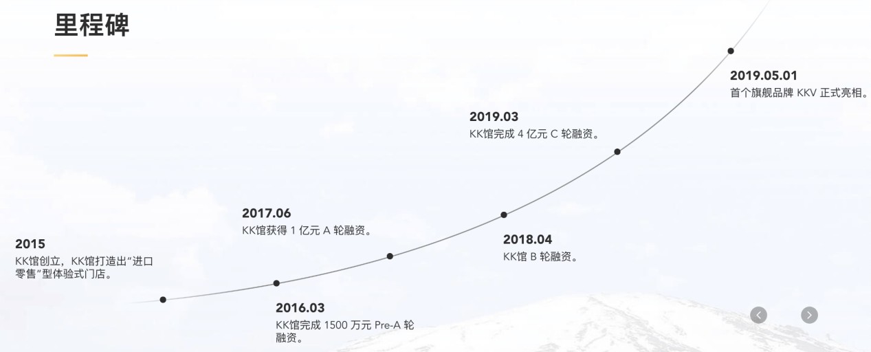 2014年,KKV的母公司KK集团在O2O的热潮中正式成立。主要经营零售美妆、零食、个护等进口快消品,当年就开出4家面积均在80平左右的KK馆社区店。