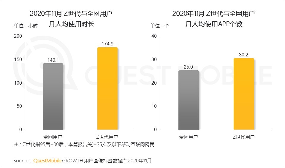 在互联网应用的使用上,“Z世代”用户群同样有独特的需求。QuestMobile数据显示,Z世代用户使用互联网应用的深度(时间)和广度(个数)均高于全网平均水平,2020年11月他们平均使用互联网174.9小时,超出全网140.1小时的水平;平均使用30.2个应用,超过全网25的水平。在各种应用中,社交最受青睐,其次是视频、网购和音乐,他们不会只用微信或者QQ等主流熟人社交产品,而是会同时使用多款社交应用。
