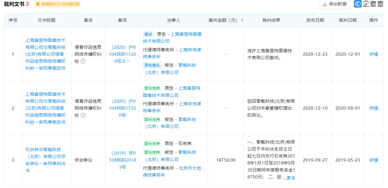 但值得注意的是,据企查查官网显示,零氪科技曾分别在2019年5月23日、2020年9月1日和2020年12月1日因劳动争议和侵害作品信息网络传播权被起诉。裁判文书显示,在上述案件中零氪科技均作为被告。