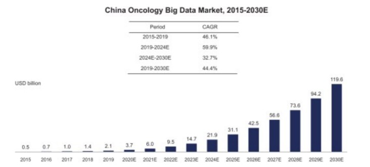 此外,据招股说明书显示,中国肿瘤大数据市场规模同样发展迅速,从2015年的5亿美元增长到2年的21亿美元,复合年均增长率为46.1%,预计到2030年将增长到1196亿美元,2019年~2030年的年均复合增长率为44.4%。