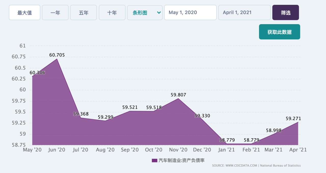 据国家统计局数据显示,2021年4月汽车制造业资产负债率为59.27%,相较上月58.99%有所增长。从2006年12月到2021年4月期间,平均值为58.01%,历史最高值为61.217%。