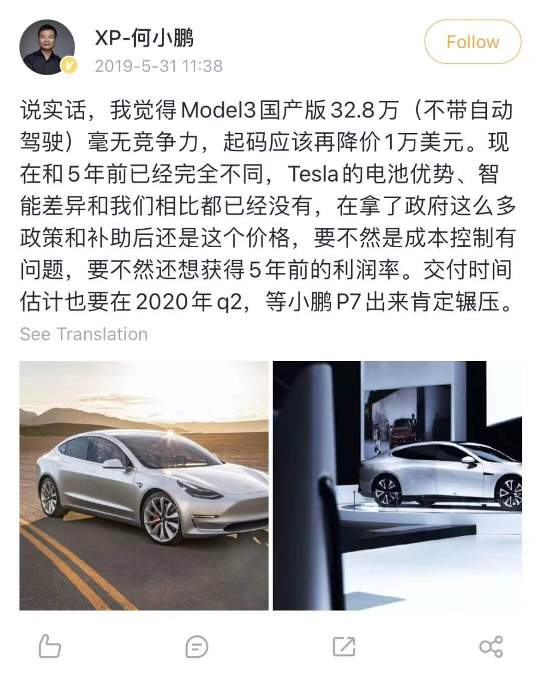 比起造车企业,小鹏不断强化的人设是“把特斯拉打到找不着东”。与之相对应的,小鹏P7也明确的对标了Model 3。于是就有了Model 3在发布国产版价格之时,何小鹏的豪言壮语:“Model3国产版32.8万(不带自动驾驶)毫无竞争力,起码应该再降价1万美元.....小鹏P7出来肯定辗压。”