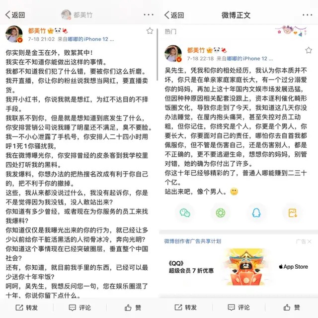 今年6月,吴亦凡“绯闻女友”都美竹的闺蜜在微博爆料称吴亦凡冷暴力和都美竹分手,并致其情绪抑郁。7月,都美竹本人再次爆料,称吴亦凡潜规则多位女性,其中还包含多位未成年人。