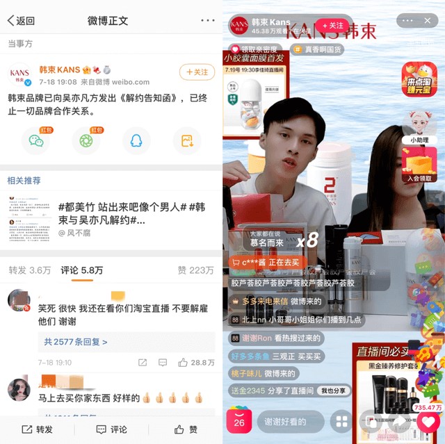 7月18日,晚上7点韩束在官微宣布已向吴亦凡发出《解约告知函》,终止与吴亦凡的一切合作关系,随后#韩束宣布与吴亦凡解约的话题便被顶上了微博热搜。