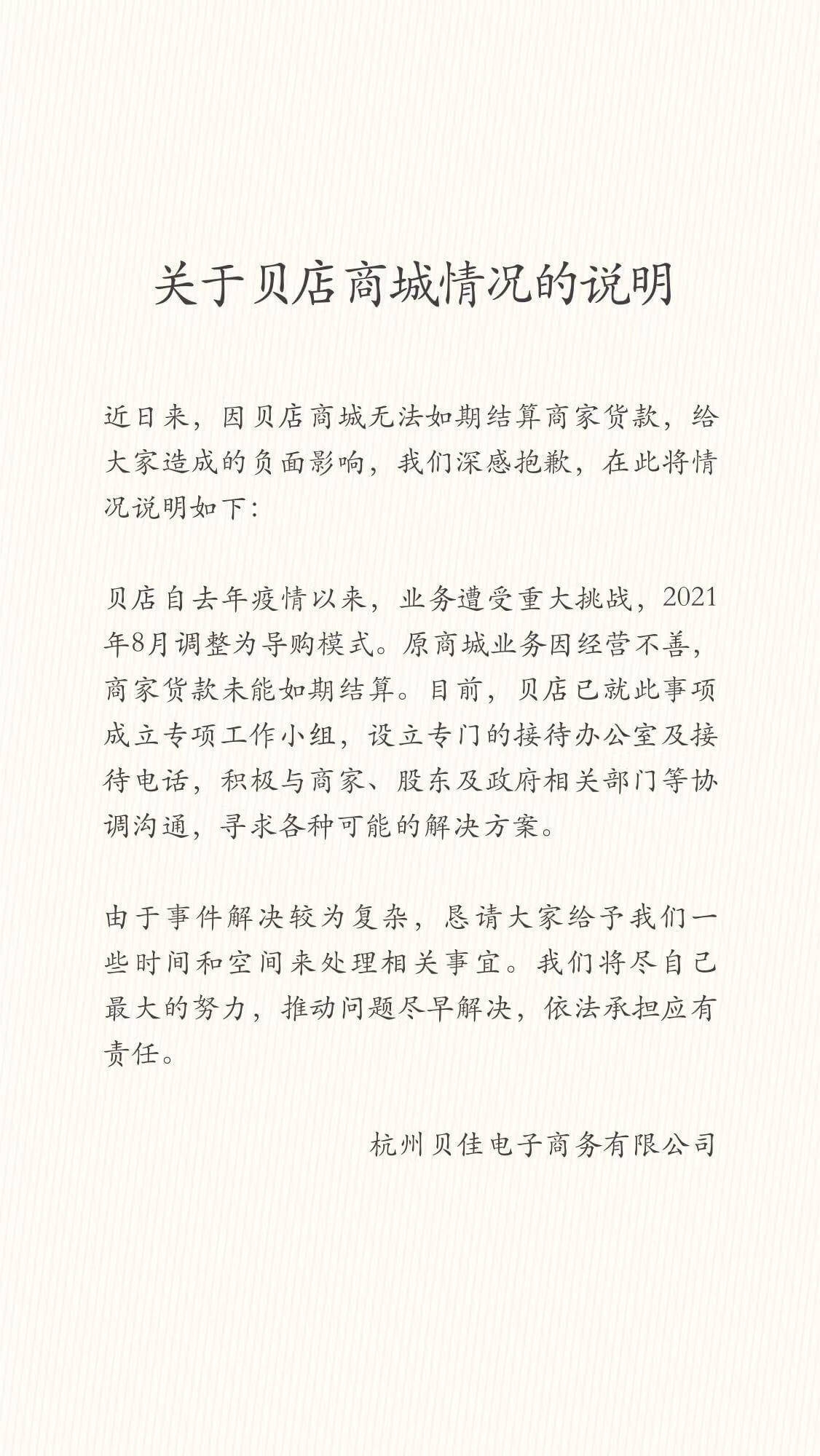 贝店自去年疫情以来,业务遭受重大挑战,2021年8月调整为导购模式。原商城业务因经营不善,商家贷款未能如期结算。目前,贝店已就此事项成立专项小组,设立专门的接待办公室及接待电话,积极与商家、股东及政府相关部门等协调沟通,寻求各种可能的解决方案。