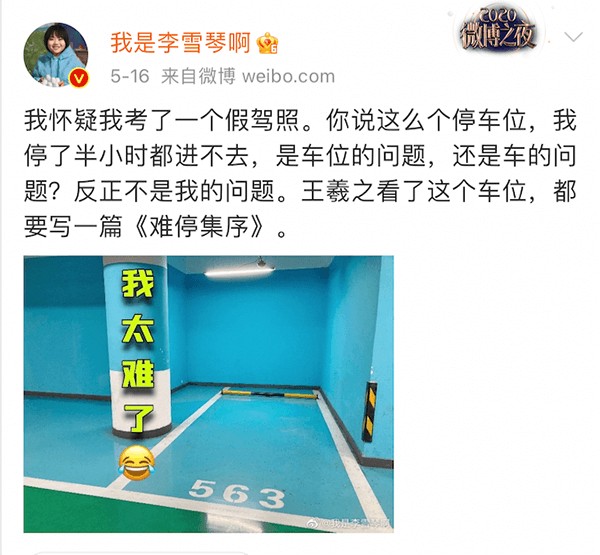 在节目、品牌广告片中,李雪琴会抛出“梗”,“梗”的范围也很广,爱情、友情、亲情、人生观、世界观、宇宙观以及日常生活鸡毛蒜皮等等,不仅接地气,网友们还能够从中得到一些共鸣,甚至“梗”还具备互动性,可以二次制造话题。比如李雪琴发了一条关于停车的微博,用了「难停集序」,网友们一下就被带入到日常生活之间拉家常吐槽的语境,互动评论就很高,也带来了品牌的互动,比如威马汽车。