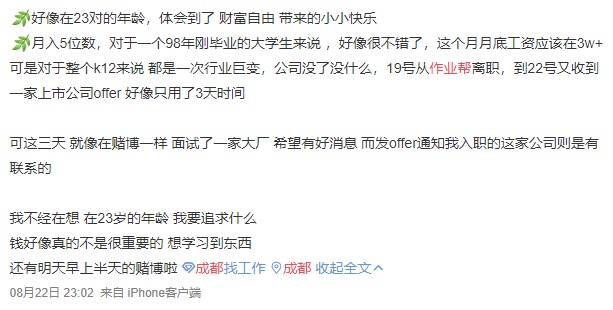 据《封面新闻》报道称,8月20日,作业帮成都分公司最后2000名员工与公司进行了最后的告别。