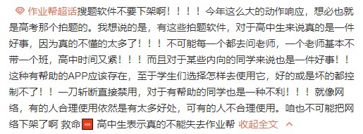 作业帮的拍照搜题功能虽然目前仍旧能够正常使用,但在政策压力下,这一功能还能存活多久没人知道,在社交平台上,用户们的担心溢于言表,一句“且用且珍惜”道尽对拍照搜题的担忧。