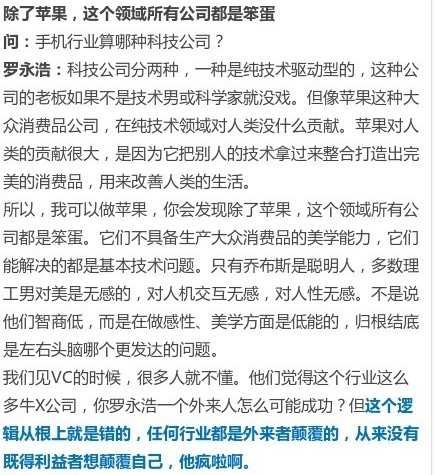 当时罗永浩的完整表述是:“科技公司分两种,一种是纯技术驱动型的,这种公司的老板如果不是技术男或科学家就没戏。但像苹果这种大众消费品公司,在纯技术领域对人类没什么贡献。苹果对人类的贡献很大,是因为它把别人的技术拿过来整合打造出完美的消费品,用来改善人类的生活。
