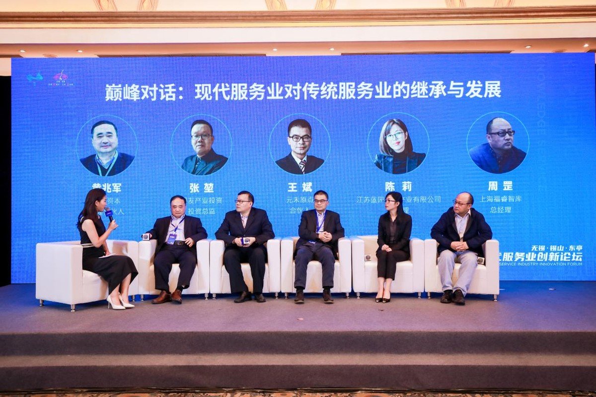 在巅峰对话环节,邦明资本管理合伙人黄兆军、用友产业投资投资总监张堃、元禾原点合伙人王斌、江苏蓝园文化产业有限公司总经理陈莉、上海福睿智库总经理周罡五位嘉宾针对现代服务业对传统服务业的继承与发展进行了思想碰撞,为参会人员提供全新思路。