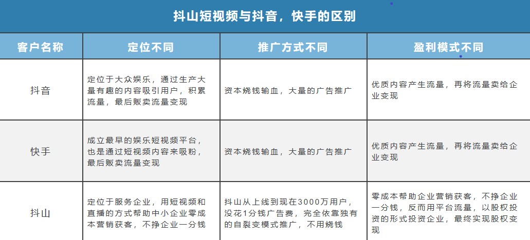 抖山创始人兼CEO任总说,抖山不是娱乐平台,抖山只聚焦于中小微企业。因为互联网时代,流量已经成为最昂贵的资源,而抖山愿意分享流量,用流量来投资中小企业,与企业共成长。