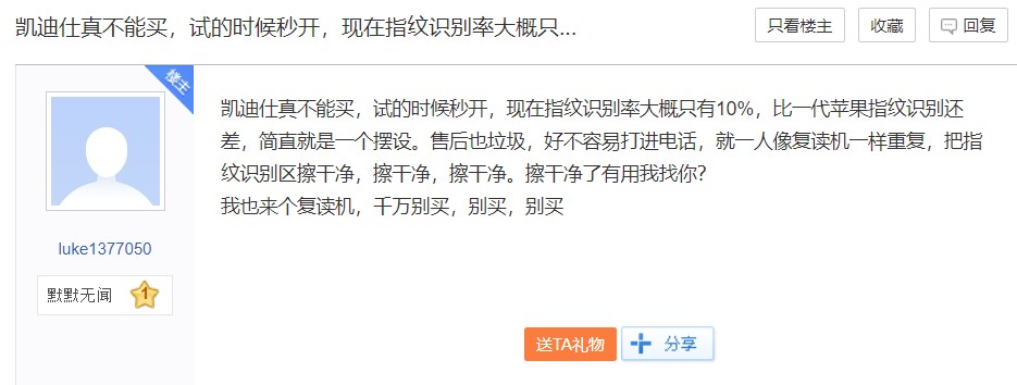 今年315前,曾是凯迪仕南京经销商的陈晓还向媒体爆料,称其智能锁产品质量太差、返修率高,并且对代理商和消费者不负责。